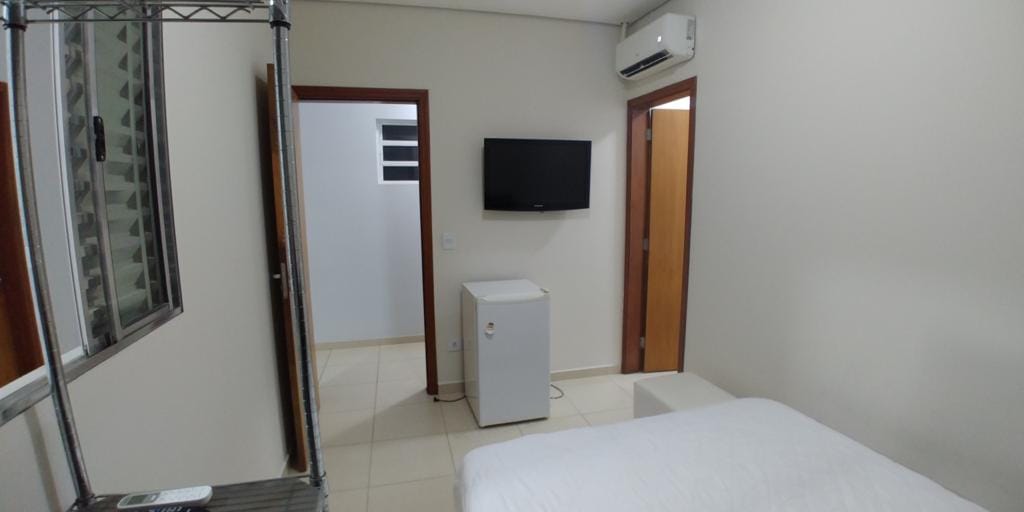 Ar condicionado, Frigobar, Tv, Armários, Cama Casal.